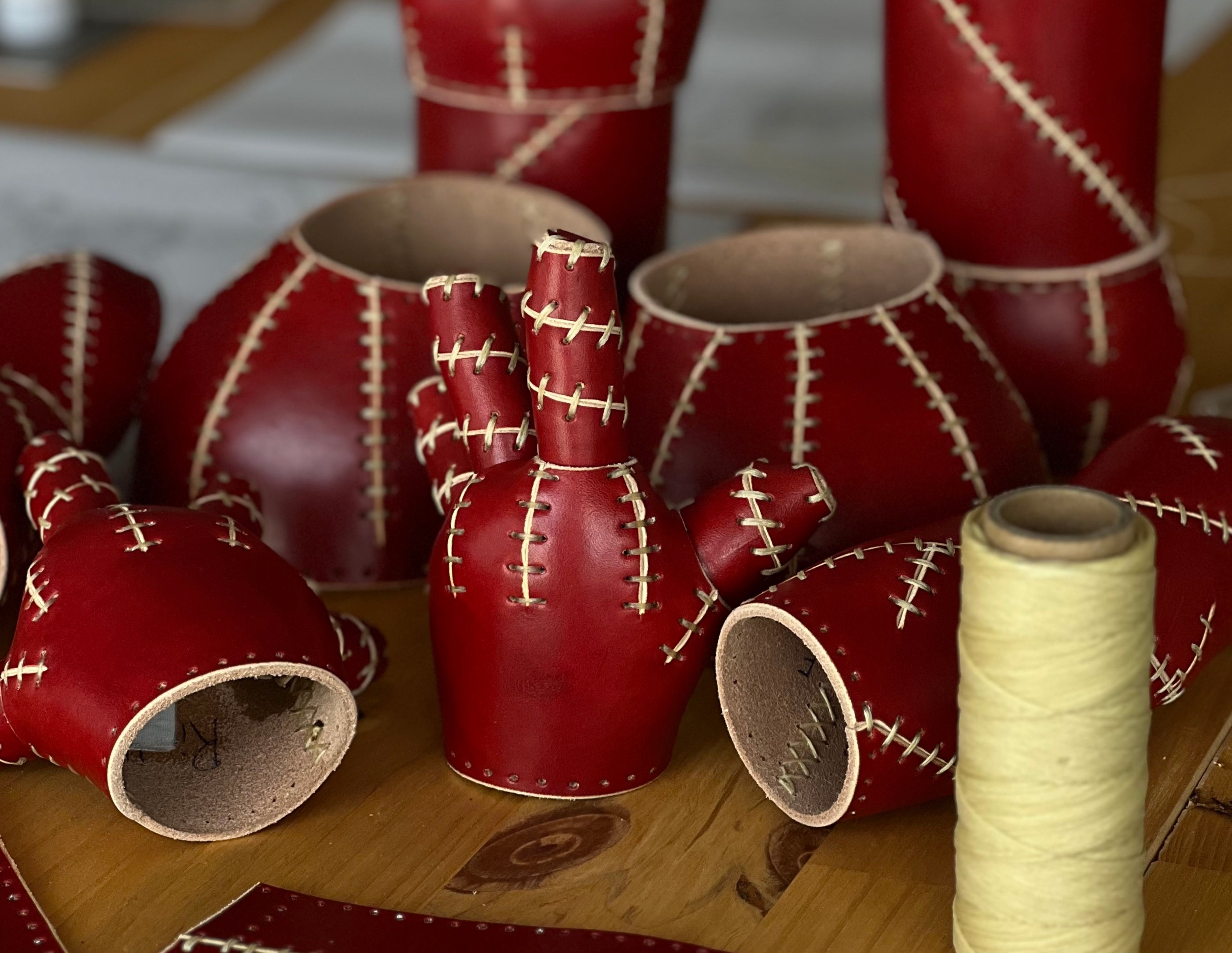A collection of handmade leather sculptures and art object. Each piece is...