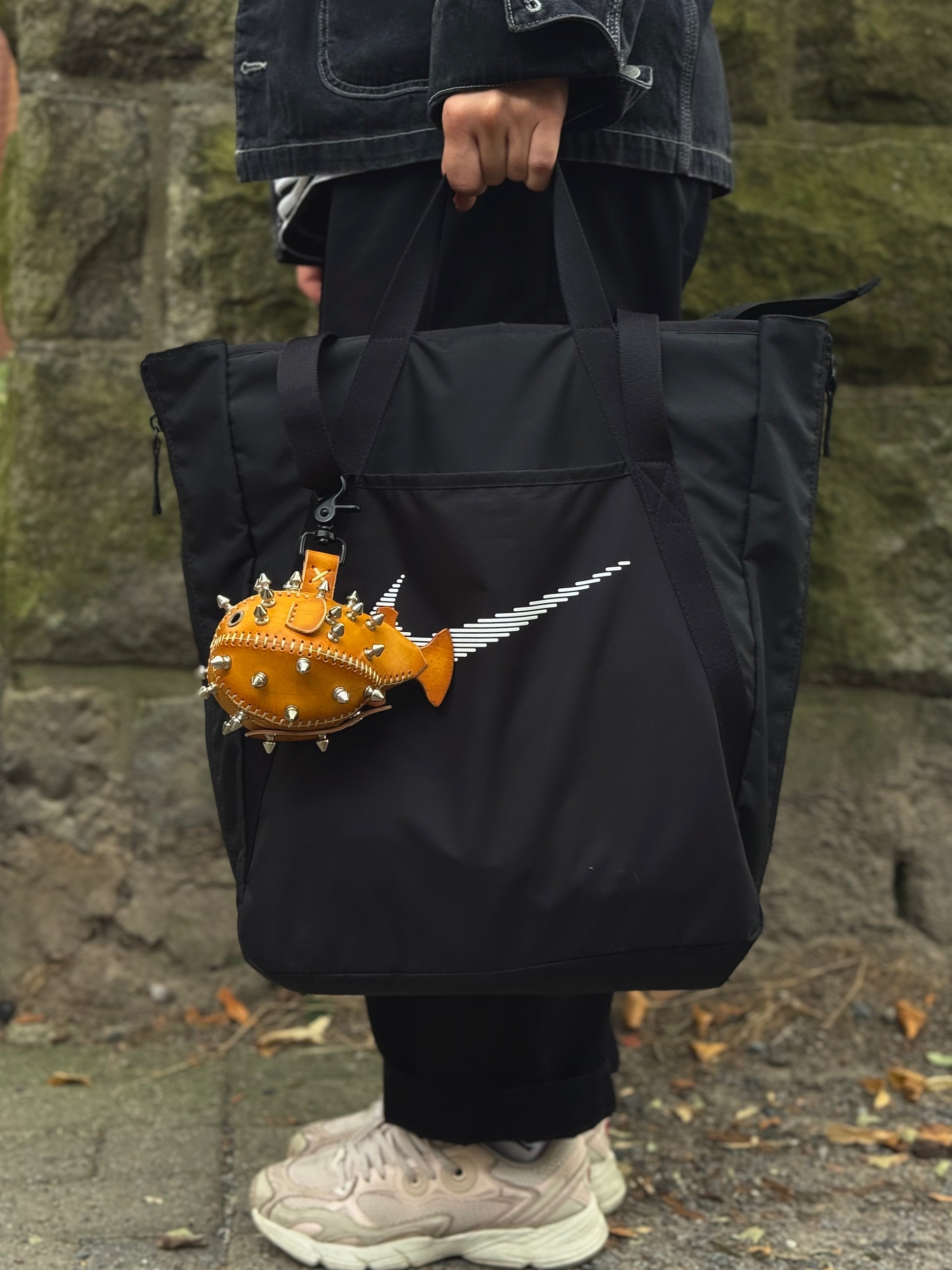 Inspired by the iconic shape of a puffer fish, the design features expressive proportions, hand stitching. The keychain includes an opening valve, allowing you to store small items such as coins, pills, keys, or other tiny essentials inside.