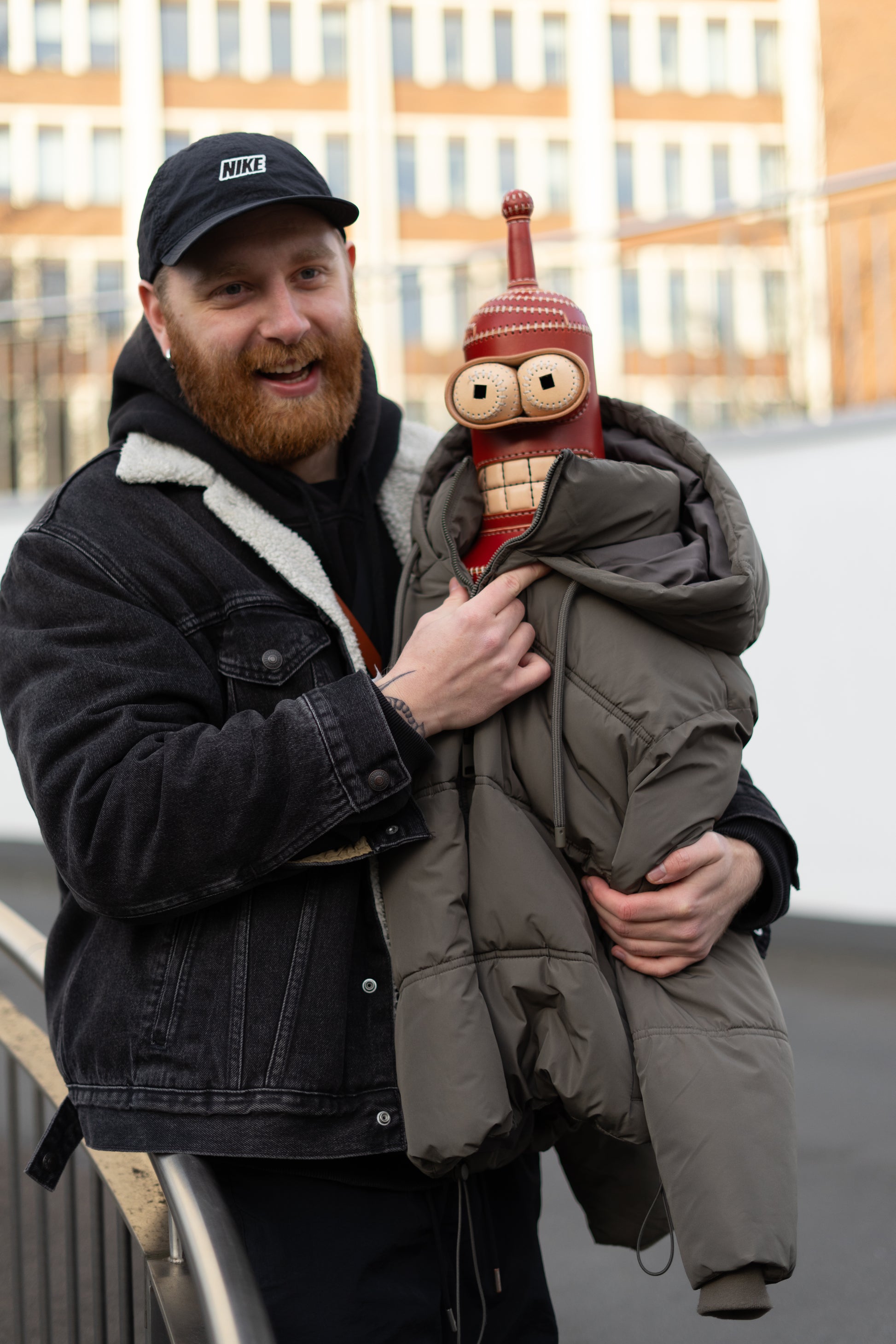 Designed as a sculptural art object, this leather robot combines bold character with functionality. Inside the body, there is a hidden storage compartment suitable for holding a bottle, small items, or personal belongings.